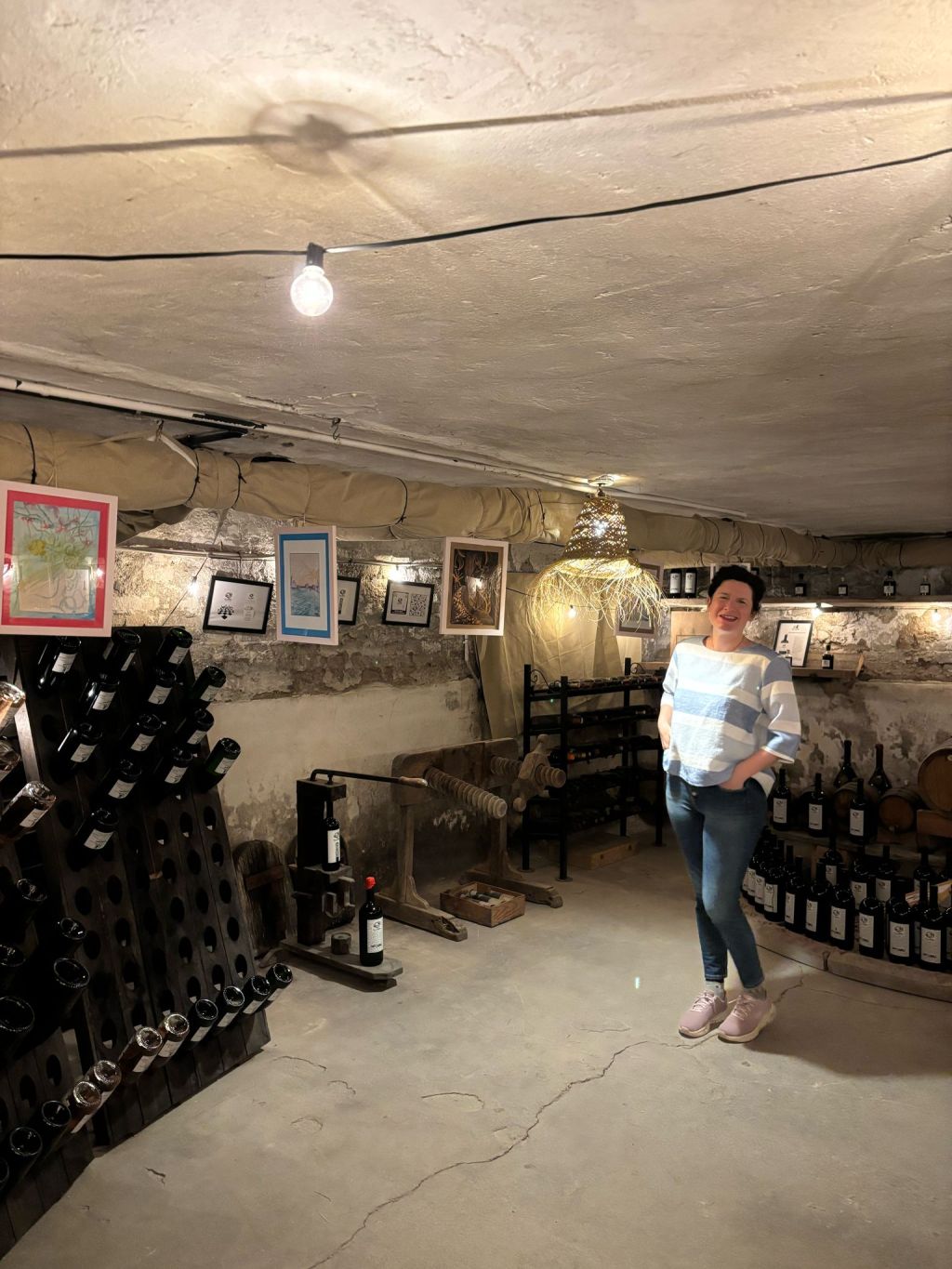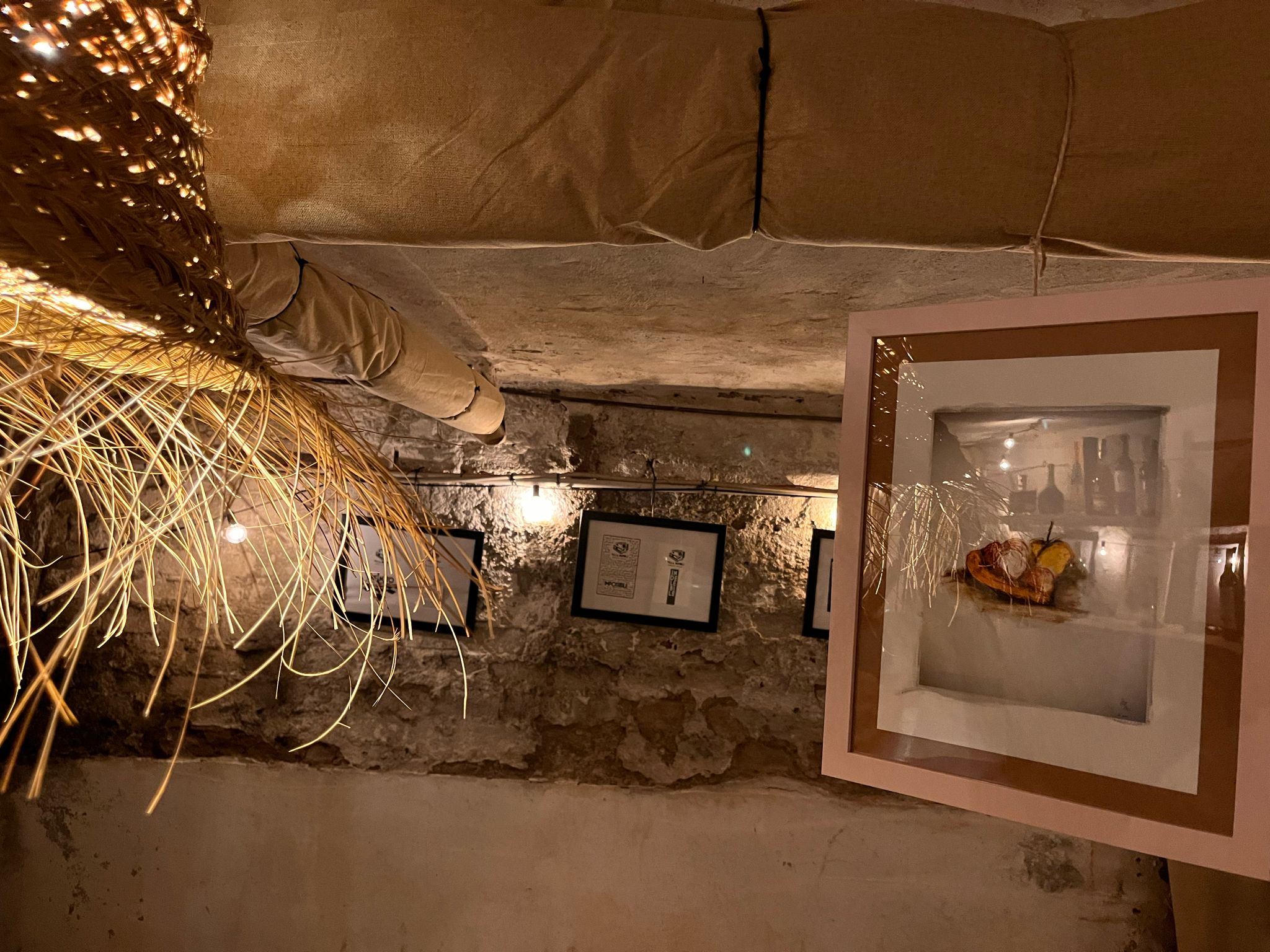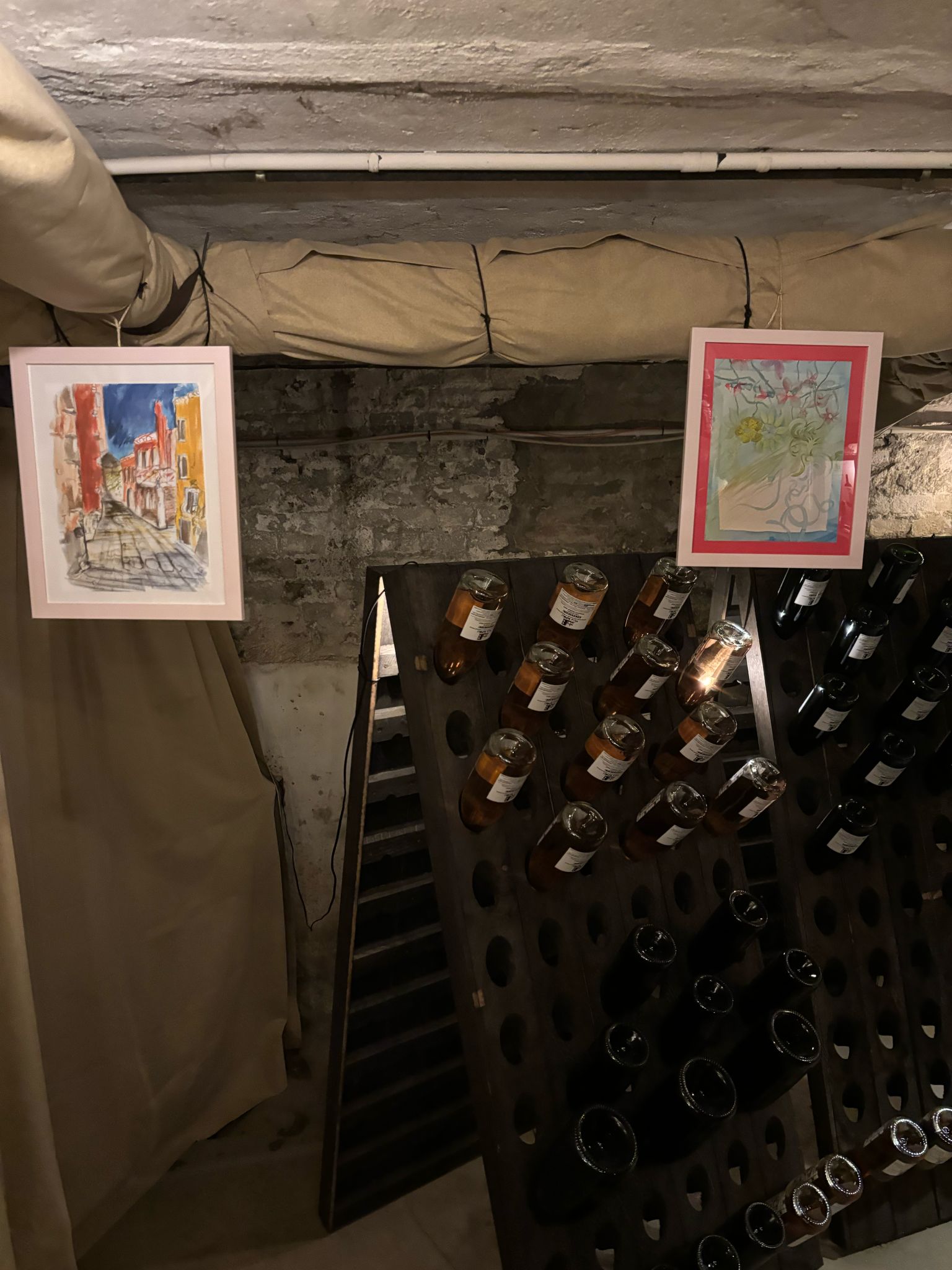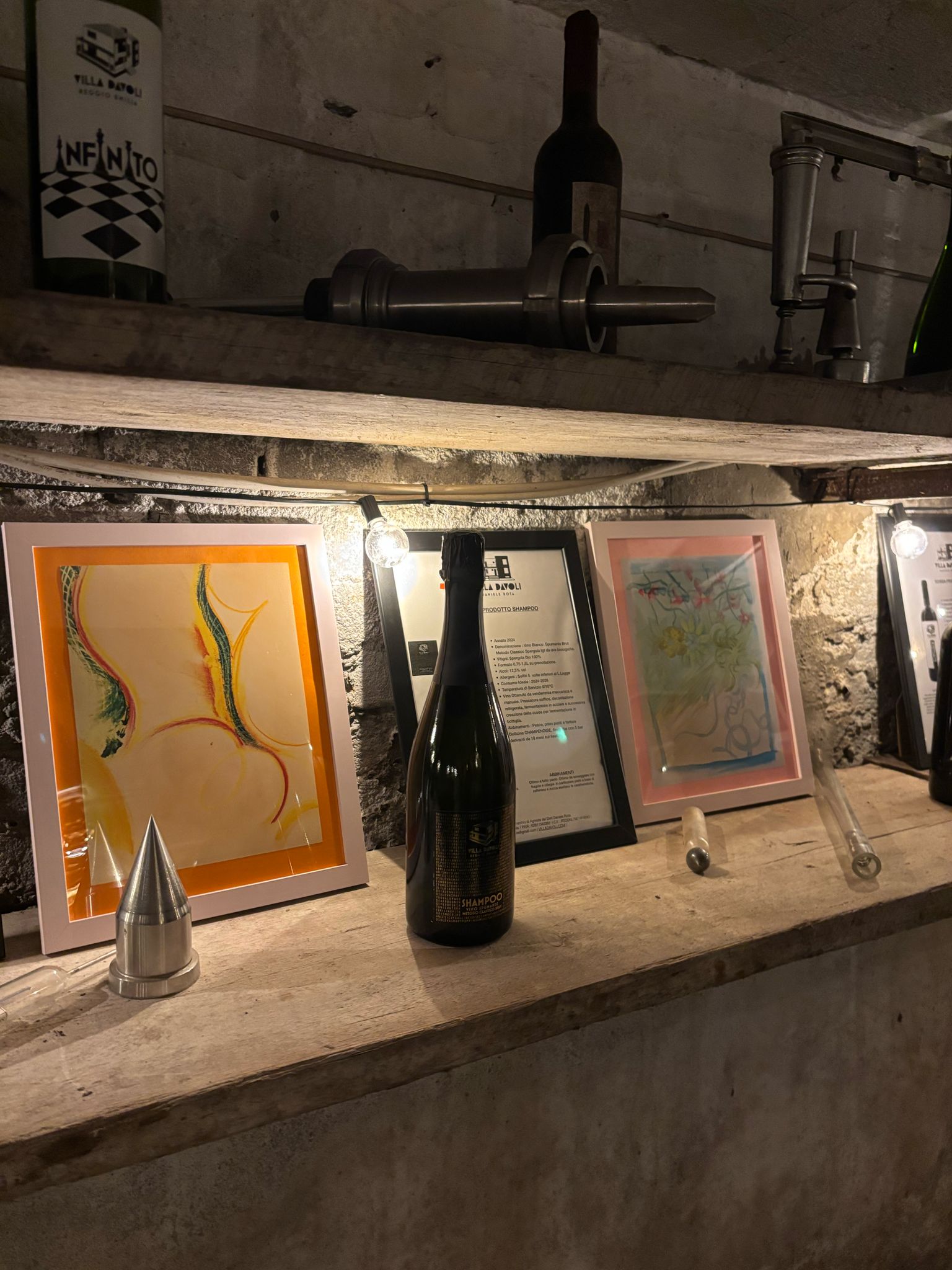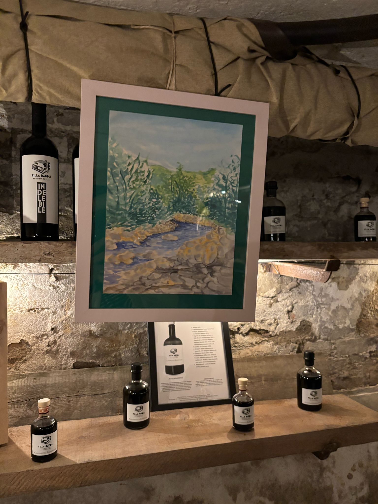 One of the most evocative spaces of the entire event was undoubtedly the intimate wine cellar of the Villa, a cozy and enveloping space where I displayed some of my smaller-format paintings. Among curated bottles, soft lighting, and the scent of wood and wine, art became more quiet, almost confidential, engaging directly with those who paused to observe.