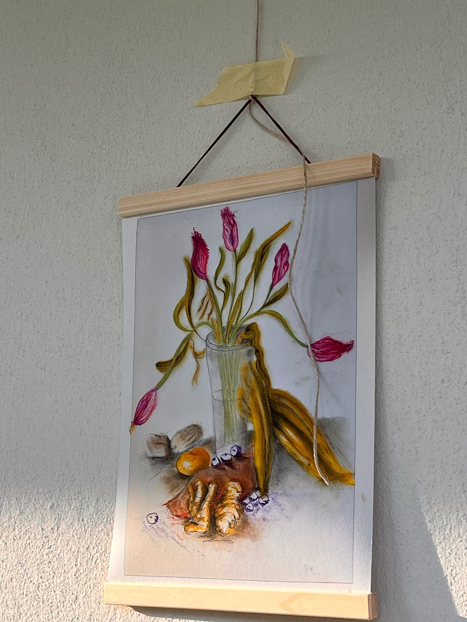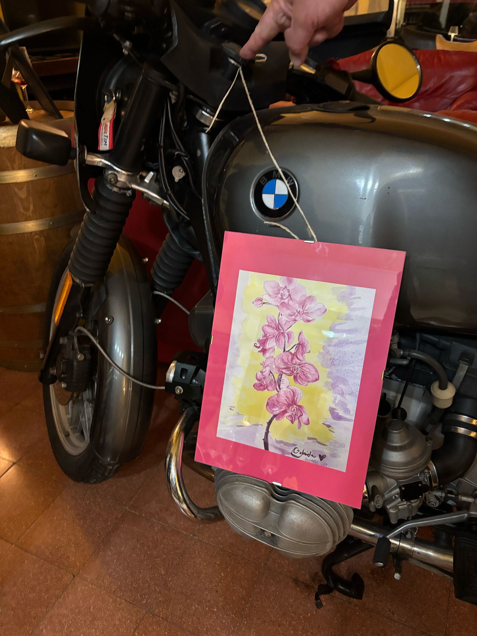 The exhibition continued outdoors on the panoramic terrace, where natural light and views over the vineyards created the perfect backdrop for my floral and abstract collection, marked by vibrant strokes, intense colors, and springlike atmospheres. Here, I wanted to bring a sense of lightness, but also an energy that speaks of renewal and a deep connection with nature.