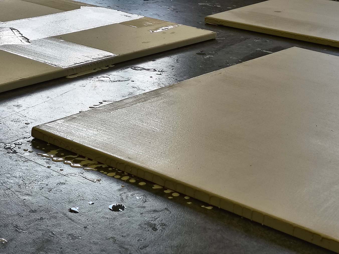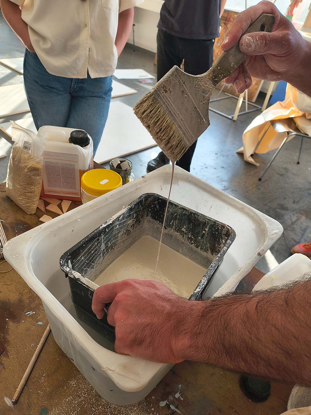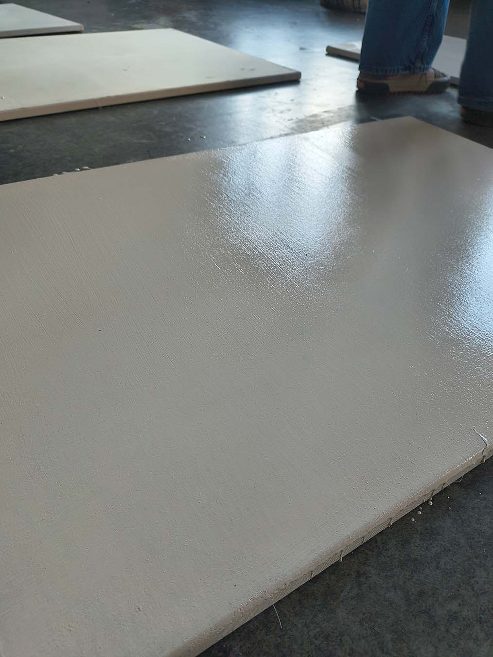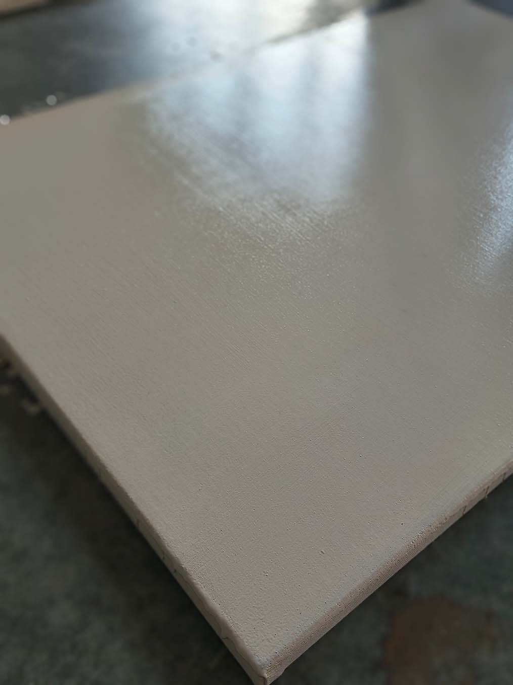 Once the mixture was ready, we moved on to carefully applying it onto the canvases that had been dried and prepared during the previous week. The surfaces, well-stretched and properly dried in a controlled environment, were ready to receive the second finish layer. Using wide spatulas and flat brushes, the creamy mixture was spread in smooth, controlled motions to ensure complete and even coverage.