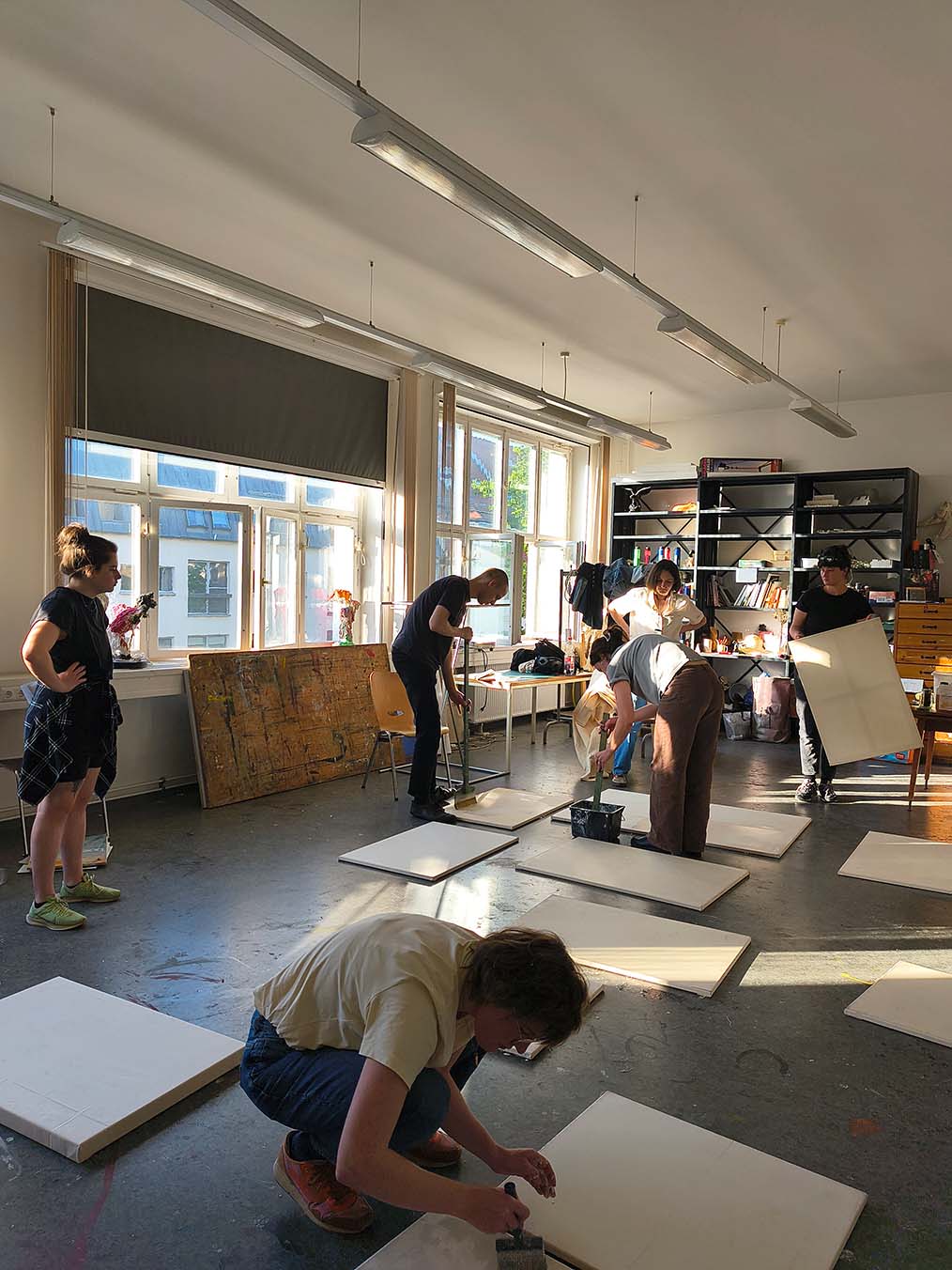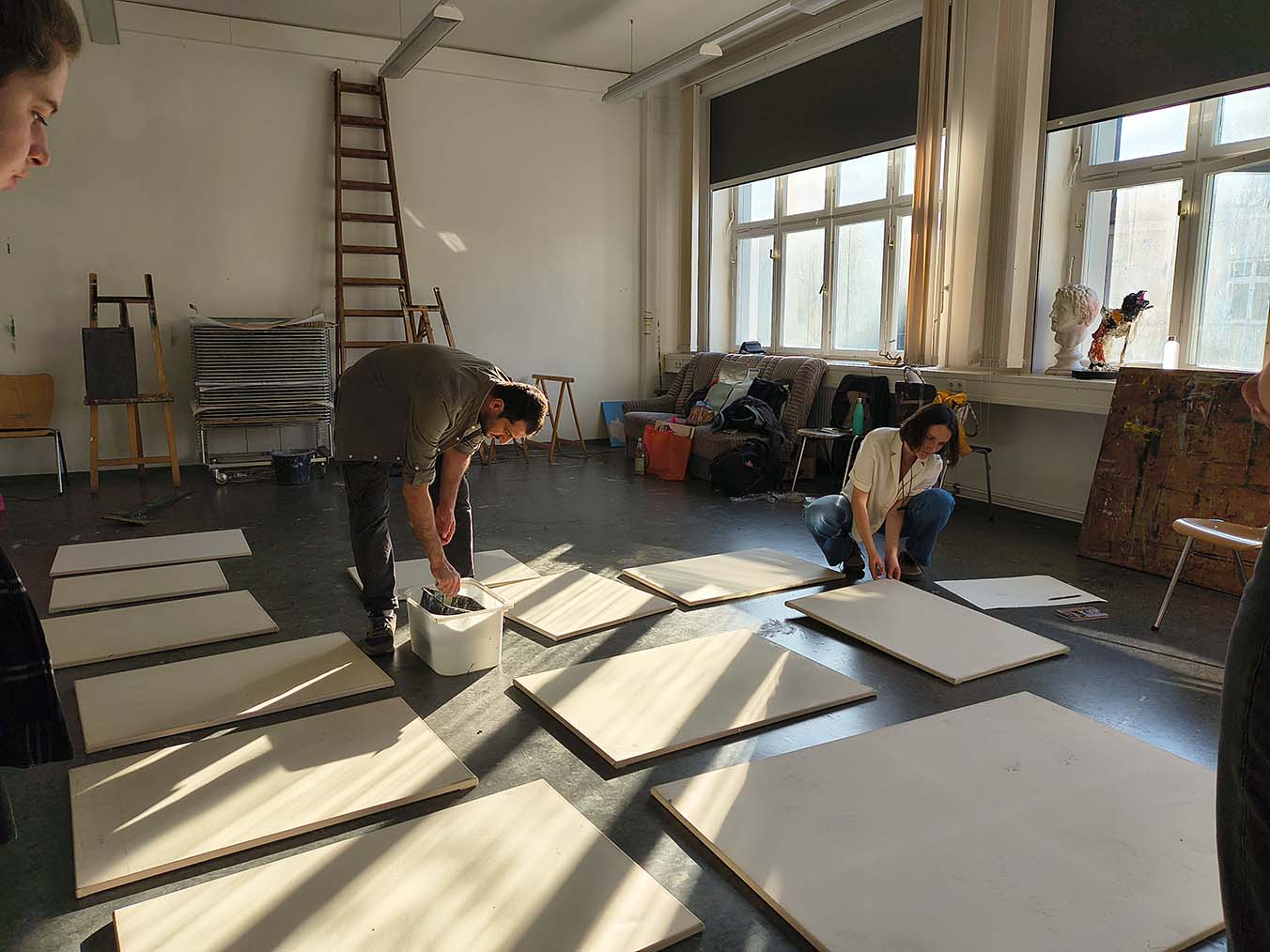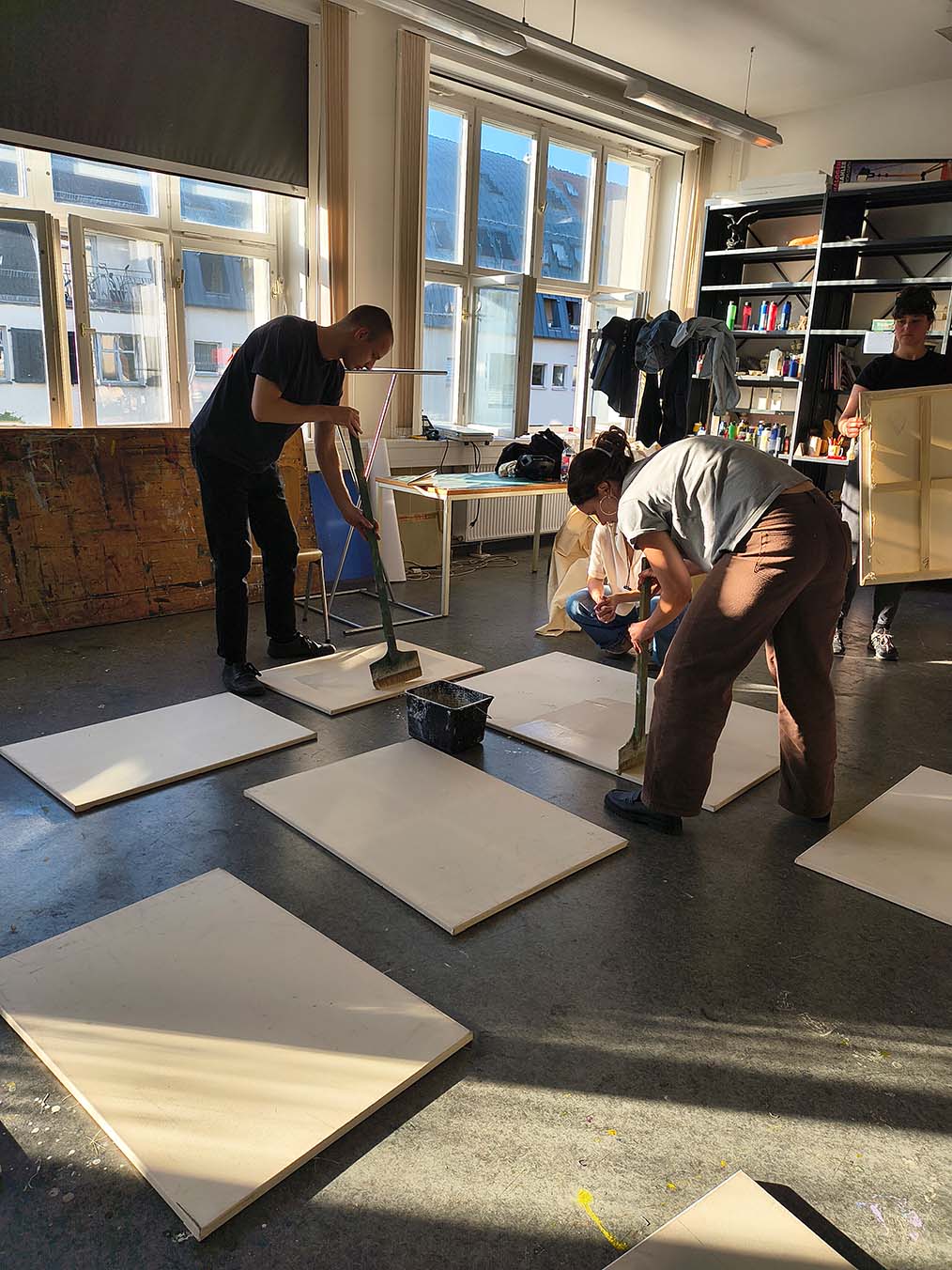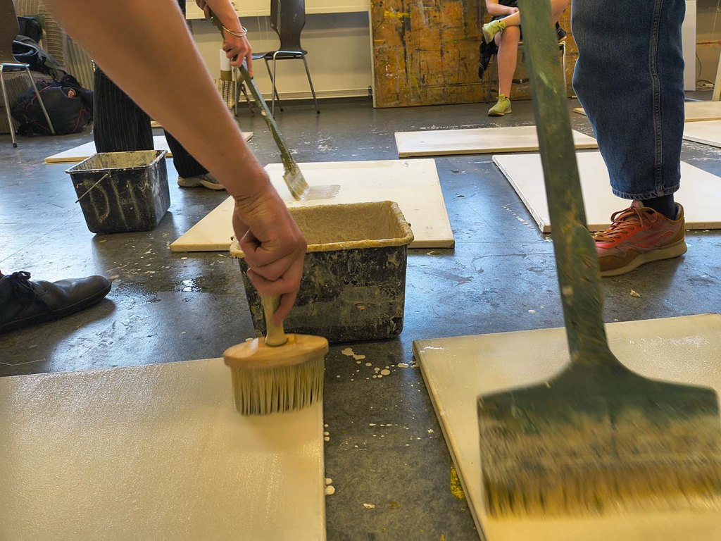 Last week we continued the preparation of our canvases and then painted over the theme we want to bring to the art exhibition at the Hochschule für Grafik und Buchkunst HGB Graphic School in Leipzig at the end of July. In particular, we devoted ourselves to preparing the second layer of finish to be applied over the previous one, which was applied and dried the week before. What does it consist of?