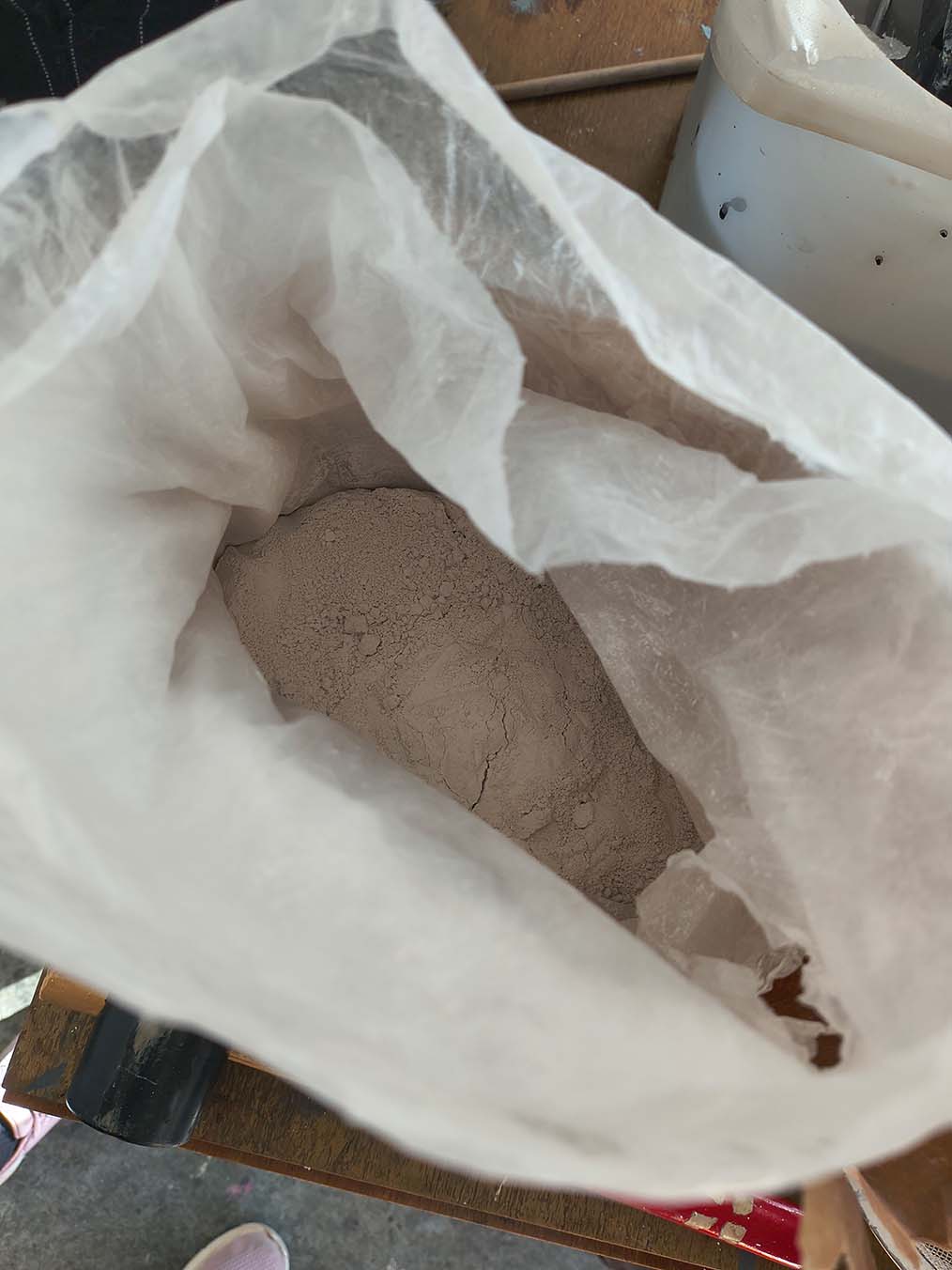 The preparation of the second layer began with great care for the composition of the new mixture, designed to give body and final strength to our canvases. To the base created last week — made of warm water and rabbit glue, now perfectly solidified — we slowly and methodically added a blend of linseed oil and finely sifted clay and chalk powder. The entire mixture was placed in a bucket, which was then set inside a larger basin filled with warm water. This helped maintain a consistent temperature and supported a smooth blending process.