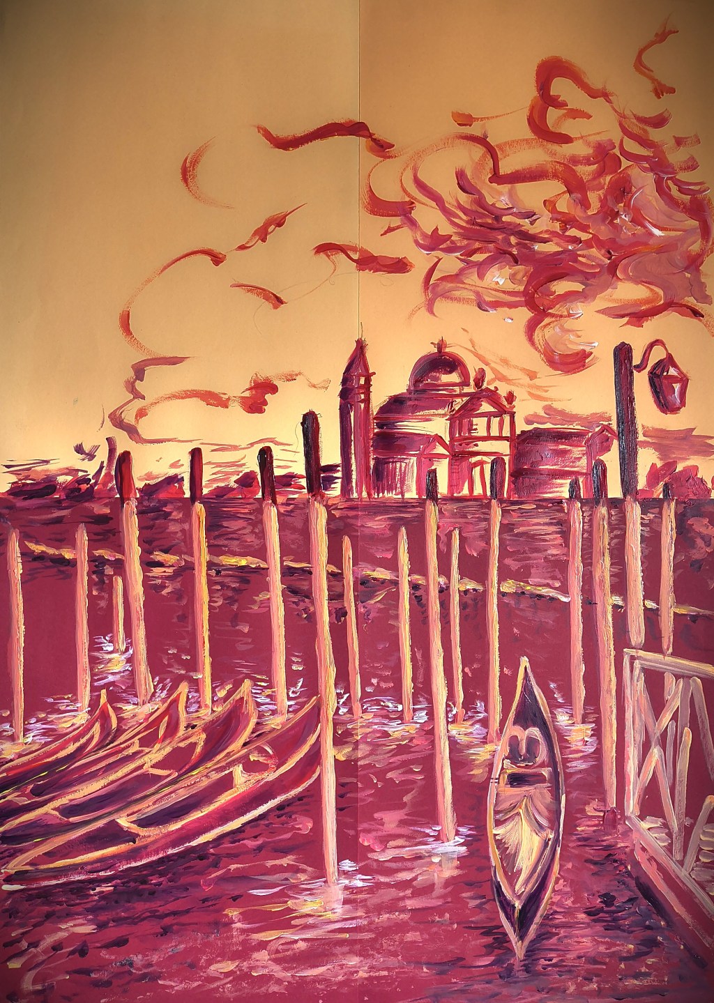Quindi nella mia esplorazione artistica “Venezia on fire” è in realtà nato come progetto di accostamento e scontro cromatico, tra tinte chiare e scure pitturando su sfondi non bianchi, come classicamente viene fatto. Ne è uscito un risultato che nemmeno io mi aspettavo, di forte impatto e quasi anche di allarme per la fase di cambiamento climatico che stiamo vivendo. Per me l’idea originale era di rivisitare Venezia con altri occhi, come di osservarla attraverso altre tinte che si discostassero dalla mera realtà. Come artista volevo “disassociarmi” dal blu, dall’oltremare e dal cobalto (colori che tanto amo) per sposare una prospettiva cromatica nuova e finora inesplorata.