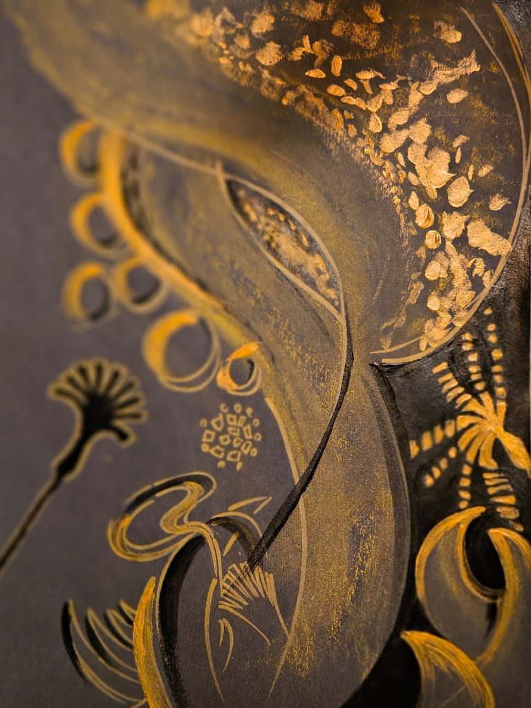 In Klimt’s art, gold takes on an almost sacred value, and it is from this vision that my work evolves, in which gold plays a central role, giving depth and vitality to the subject. The use of this colour is never accidental, but rather a deliberate choice, capable of defining and shaping the form. Black, on the other hand, becomes the ground on which the gold expresses itself, appearing with a force that suggests depth and mystery, in a play of light and shadow that seems to restore an almost dreamlike dimension.